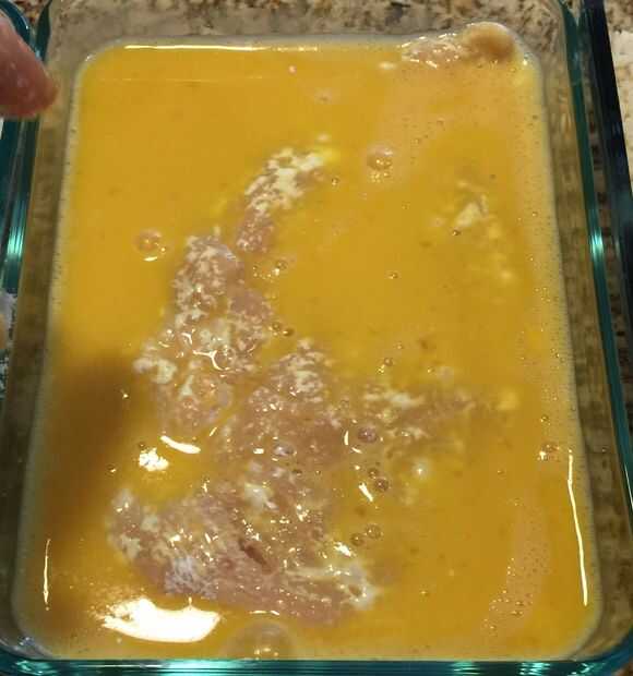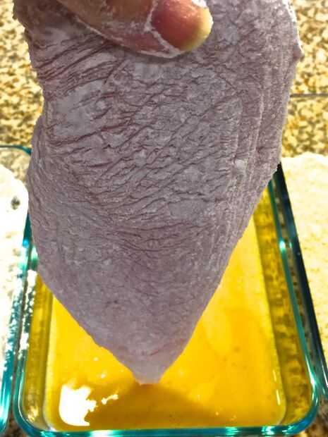 A continuación, agregue la mama espolvoreada con harina para pan #1, con harina. Cubra uniformemente cada lado, sacudiendo suavemente el huevo sobrante.