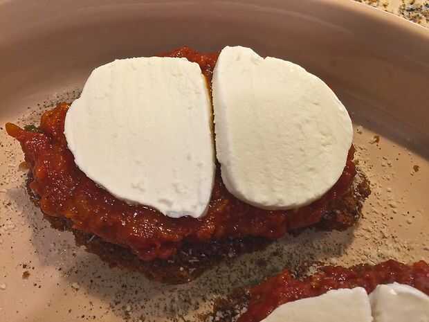 Ahora, agregue 2 trozos de queso mozzarella fresca a cada pieza de pollo.