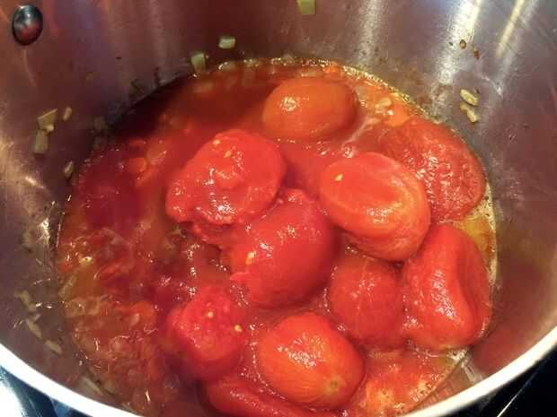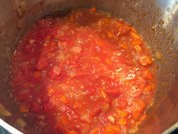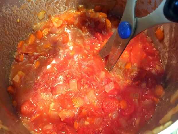 Añadir la lata de tomates enteros, incluyendo jugo. Con unas tijeras, cortar los tomates en trozos pequeños.