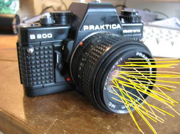 Viejo o roto SLR (tengo una Practica B 200 roto, hecho en el DDR para E 3.50 en la 2 º tienda de mano). Está equipado con una lente estándar de 50 mm F 1.8, en muy buena forma. La cámara pesa una friolera de 750 g y vino con la mitad de su estuche de cuero.