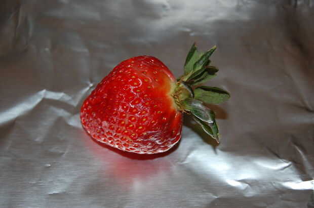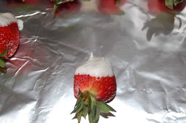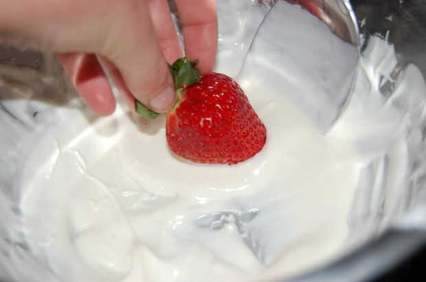 Arranque las hojas de la fresa.  Éstos trabajan bien para utilizar como algo para mantener al mismo tiempo de inmersión. Inmersión de un solo lado en el chocolate. Configurar chocolate lateral para configurar.