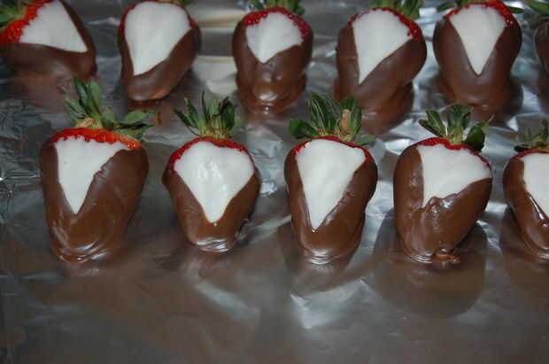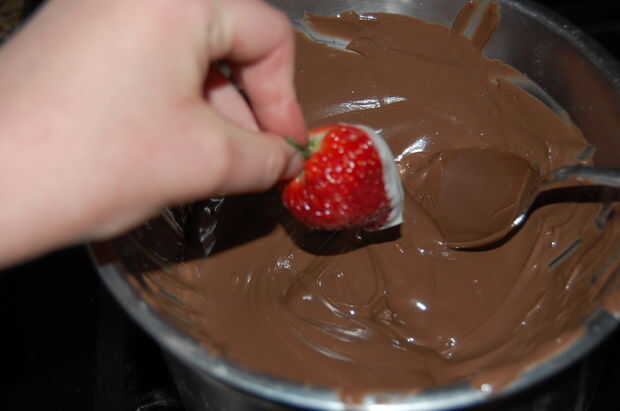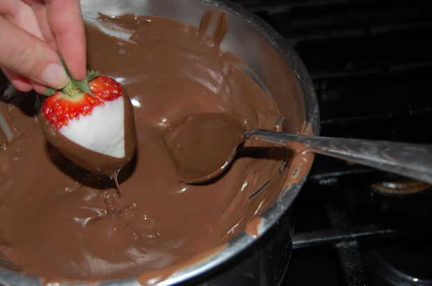 Tomar su fresa y sumerja el lado no cubiertos en el chocolate. Gire como hacerlo para que crear un V en el frente.