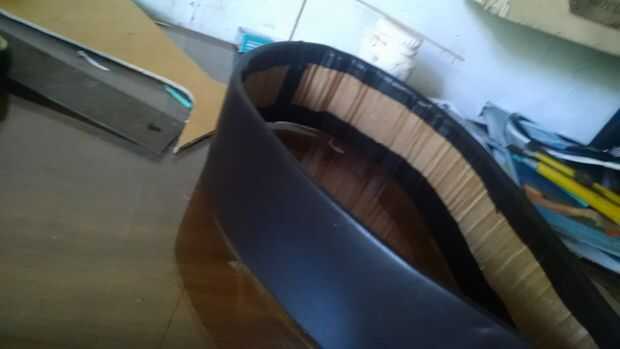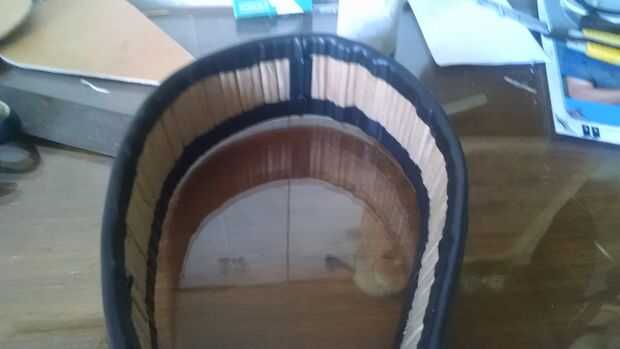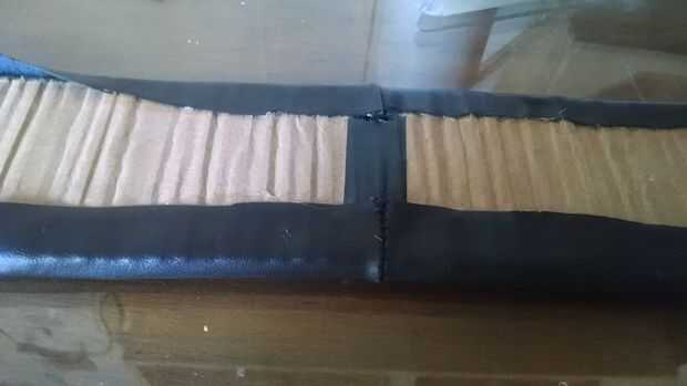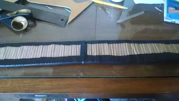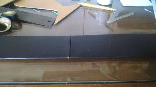 Pongo la EVA entre el cuero y la cartulina (7 cm x 75 cm), pasó el pegamento en los bordes del cuero y el papel y después de seco se unió a las partes.