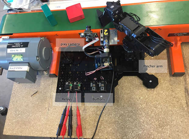 Para facilidad de uso y modificación tomamos el controlador robotix-m de su posición en el brazo y en la placa. Tiene más espacio allí y con los cables cortos que son capaces de conectar la cámara pixy y todos los demás al controlador.
