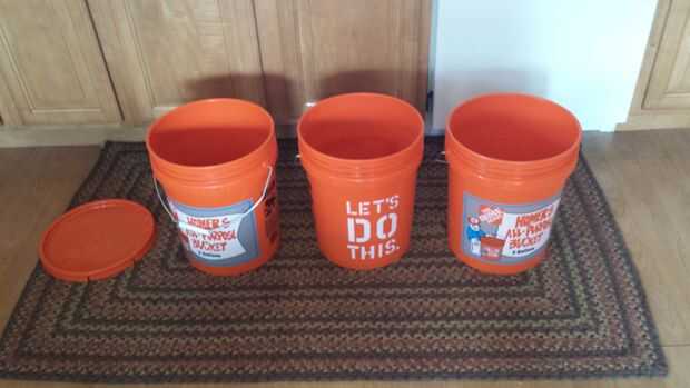 Usted también necesitará contenedores que anidan. Compré 3 cubos y 1 tapa de la tienda de hardware (total $10). Podría utilizar viejos cubos de servicio de alimentos o cubos de gatos para que sea menos costoso.