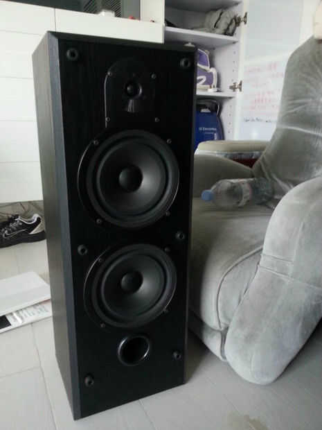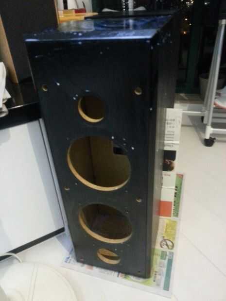 Después de mi segundo altavoz adquirió, barato, todos los controladores, puertos, y componentes de x-over fueron sacados de la caja. Parrilla del altavoz fue conservada para uso posterior. Con todos los componentes fuera de lugar, el recinto fue cubierto con pintura impermeable madera base de agua gruesa. He puesto tres capas en la mía. La capa dejar secar completamente. Con una nueva pieza de material del techo, trazar las aberturas de los conductores y los puertos para que coincida con los orificios de la caja con unas tijeras. Dejar la arandela de rejilla apertura solo. Guarde este pedazo de techo para el paso 4 cambiar la arandela de rejilla con imán fuerte en el recinto. Vuelva a instalar el componente de x-over que los polos de enlace listo para la conexión.