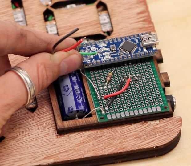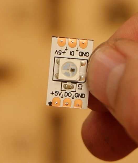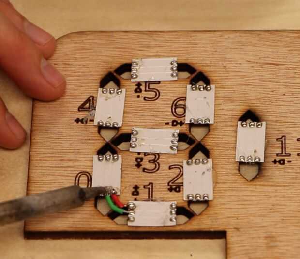 4. Ahora se puede recrear la tira de Neopixel. Corte la tira y de la soldadura de los cables entre los LEDs, garantizando que los datos siempre se va a datos, 5V a 5V, tierra a tierra. Junto a los números grabados en la madera son más y menos símbolos (que representan a 5v y GND respectivamente). Estos símbolos ayudan a asegurar que siempre estás soldar los pines de derecha juntos.