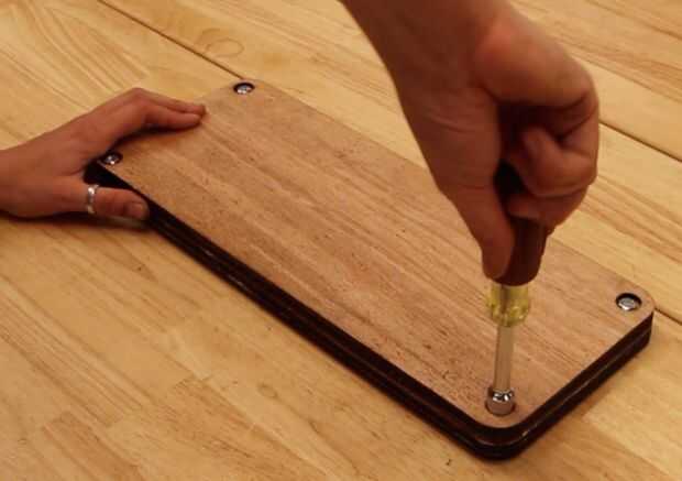 Tope de cola en la capa inferior. Unir dos dígitos de perno y pegue la capa de dígitos de la tuerca hexagonal en la parte superior. Alimentar los pernos de la parte inferior (utilice una arandela o cortar un separador acrílico entre la madera y la tapa hexagonal) y capas de parachoques y pila de los paneles en el siguiente orden (de abajo a arriba):