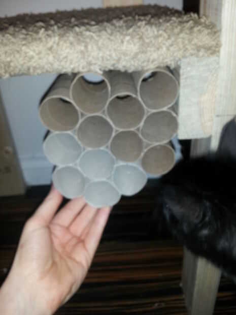 Éste era realmente simple. Pegan algunos tubos de papel higiénico. Puede pegar o engrapar toda la estructura de la torre del gato.