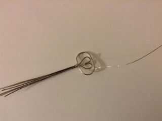 Una vez que termines tejiendo esta parte (¡ buen trabajo!), envuelva el cable alrededor de la parte inferior de los óvalos en el sándwich como para fijar el cable fino al principio. Luego con el alambre fino y utilizar los dedos o pinzas para empujar el extremo cortado como Ras al resto de la llave como sea posible para que no te pique.