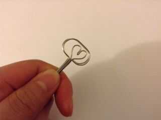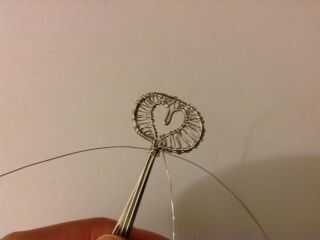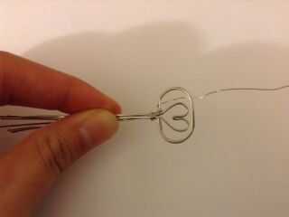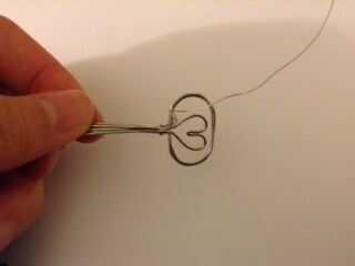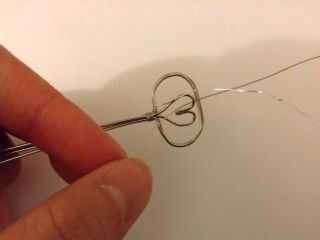 Ahora vas a tejer el espacio entre el corazón y el óvalo, para ello, corte el alambre fino, dejando la longitud de una envergadura de alambre conectado a la llave sin terminar. Luego Envuelva el cable alrededor de los dos dos veces en óvalos y luego alrededor del corazón (usted necesitará insertar el cable en el corazón o los óvalos, así que esto es realmente frustrante; consigue enredado el hilo). Esto es difícil de explicar, así que ver las fotos de arriba. Es básicamente el mismo que el tejido para la "parte inferior de la tecla" excepto que tratar los dos óvalos como una parte de tejido y el corazón como el otro.