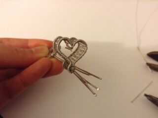 Para terminar de tu corazón, corte los dos lados paralelos para que se peguen hacia fuera más allá de la parte del principio aproximadamente 0,25". Luego pégalos en el principio del tejido para que se conectan las dos mitades del corazón. Doble los extremos 0,25" hacia atrás de modo que las dos mitades firmemente se enganchan juntos.