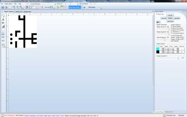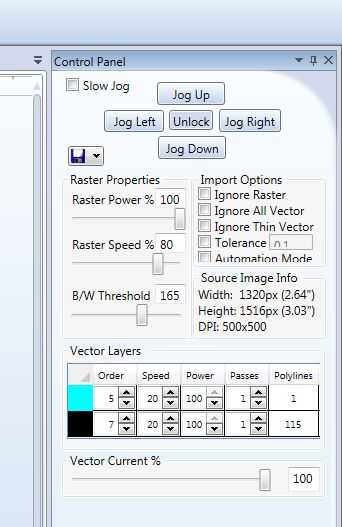 C. configurar su configuración de energía, de trama fui 100% energía y 80% de velocidad para que sea agradable y profundo. Para Vector fui 100% energía y 20% la velocidad que yo sepa que este es el escenario apropiado para mí cortar a través de acrílico de 1/4.