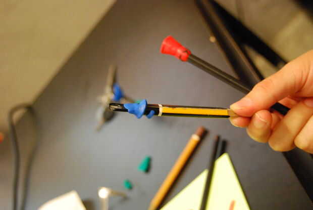 Para este experimento de la cadena dominante solía sugru azul reutilizar un trozo de una cremallera rota, conectarlo a un lápiz más pequeño.
