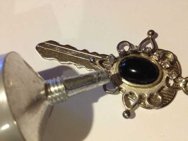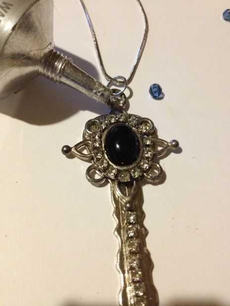 Centro el colgante en la llave, luego la parte posterior del pegamento y dejarlo establecido. Pegue el bling alrededor del borde del pendiente y al frente de la llave. Pegamento extras granos de cierto color. (Agregó después el siguiente paso, pero todavía aceptable.)