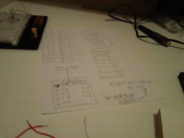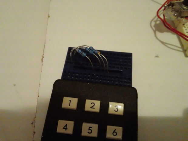 Conecte las clavijas para las filas 2 y 3 (en mi caso pins 2 y 3) a + 5v a través de resistencias de 10K Ohm. Hacer lo mismo con los pernos de columna 1 y 3 pernos (en mi caso pines 5 y 7).