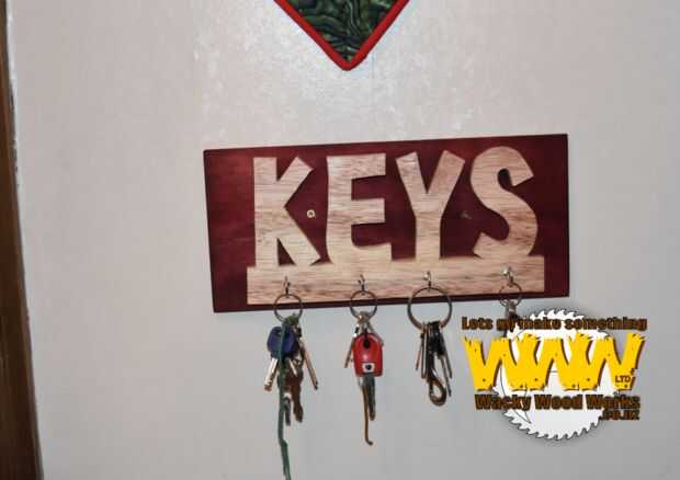 Cortar un tablero de juego de 10mm y me aplique un tinte de palo de rosa para dar un bonito contraste a la madera blanca. Sujete el soporte en su lugar en la tabla y utilice dos tornillos de la parte posterior para mantener en su lugar y también Taladre los orificios para los ganchos que de colgar las llaves.