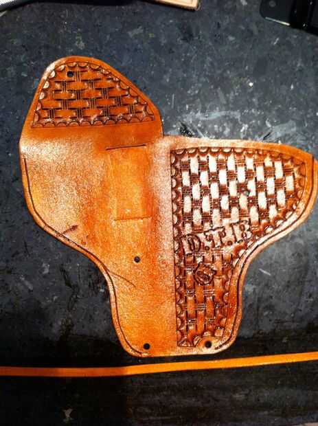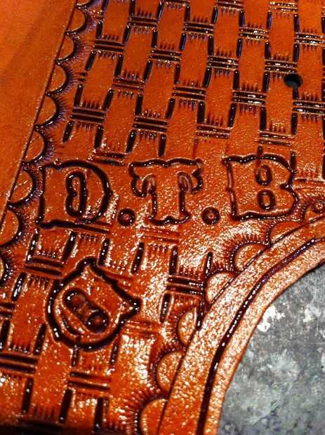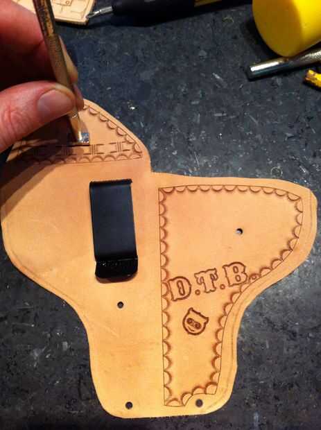 Con la línea de salida del patrón y las iniciales (el cuero debe ser húmedo para ello. Parece seca, se siente fría al tacto)
