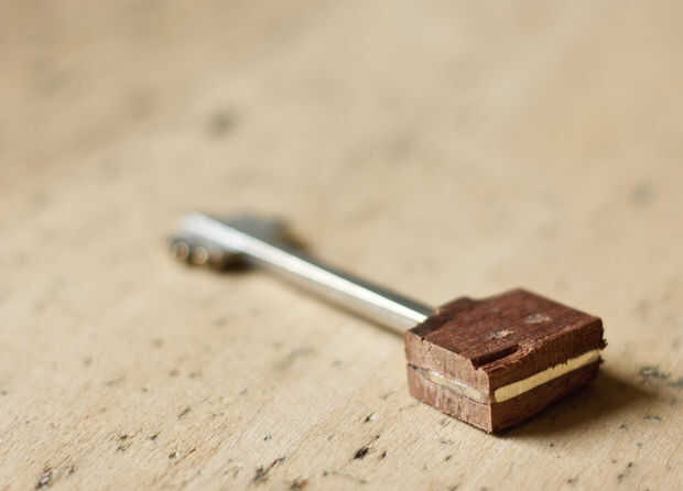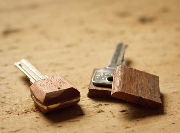 Hacer el mismo proceso con las otras teclas. Rayar la frontera hasta llegar a la chapa de la llave. Este metal es muy suave, es probablemente de bronce, para que modelo y cambiar la forma de la llave. Hacerlo con la lija más áspera y luego cambiar rugosidad paso a paso, se puede pulir con la misma madera al final del proceso.