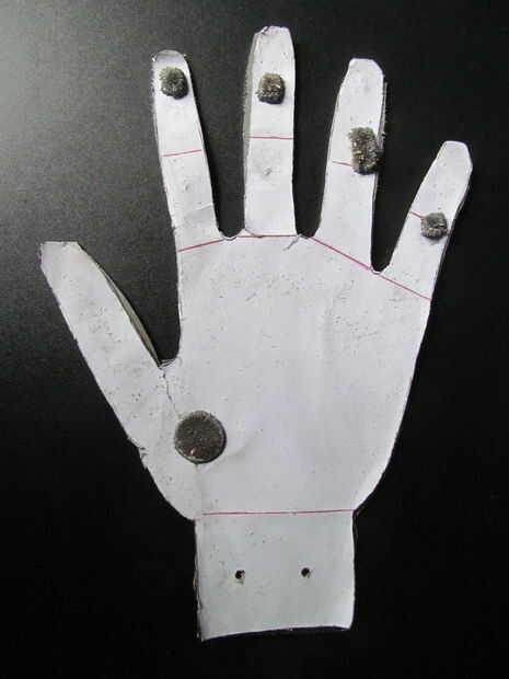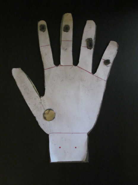-Utilizar la segueta para cortar tanto de la mano como usted puede, luego cambiar a la Sierra de marquetería -Perfore los círculos rojos en la parte inferior de la mano; hacer los agujeros del tamaño de los clavos que desea utilizar para conectar la canasta clave a la pared