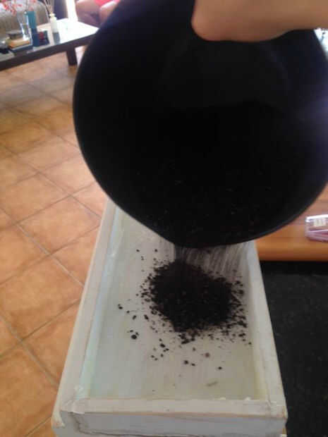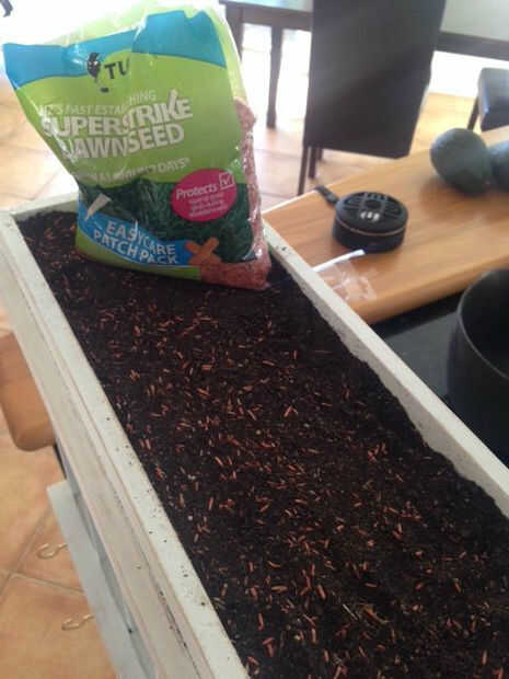 Literalmente, usé un corte encima de bolsa de plástico que me dieron forma al supermercado pero si quieres lujo ir por el oro. una vez que el plástico se midió hacia fuera me pegué con pegamento de madera otra vez y dejarlo reposar un par de horas. Ponemos una bolsa de arroz en ella por lo que podrían llenar el espacio y hacer establecer correctamente... un poco trabajado. Una vez seco (sobre todo), lleno con suelo sano y capas con semillas de césped.