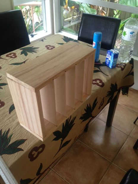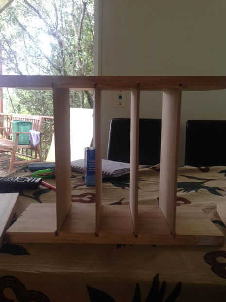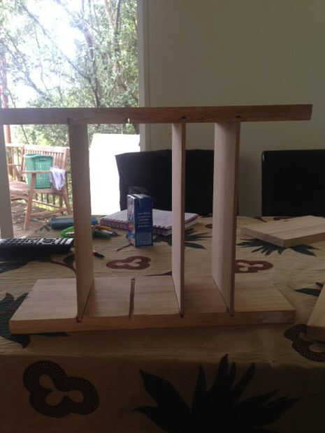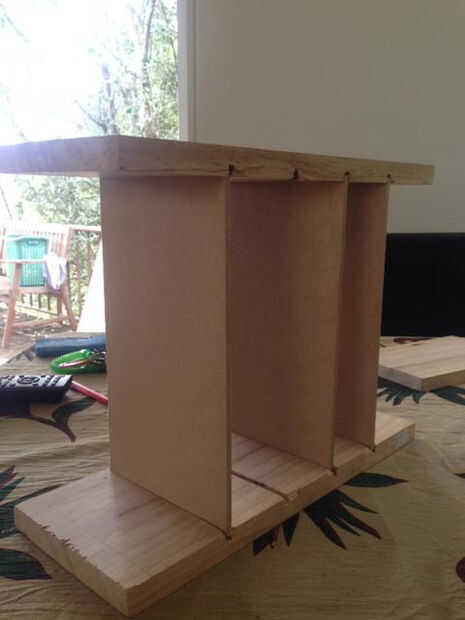 Después de asegurarse de que coincidan las ranuras de la pared interna a cada lado de los trozos de madera superior, alinee las paredes en la parte inferior y la pieza superior de la madera.