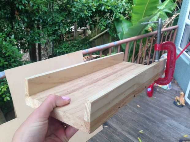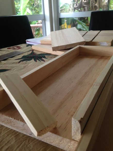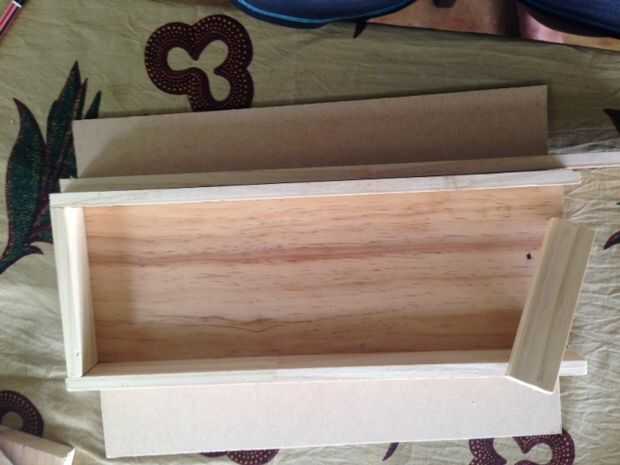 Para esta parte se utilizó una mezcla de pegamento y clavos. En primer lugar una línea de pegamento en las piezas de madera de lado y luego lo forro con mucho cuidado y hasta clavar un clavo en cada lado (para las piezas más largas, no las anchuras más pequeñas). terminamos de pegar sólo los lados pequeños abajo ya que los clavos fueron demasiado intensos para los cachitos, dividiría a la madera. abrazadera para tal vez una hora o así para asegurar que se ha secado y asegurar.