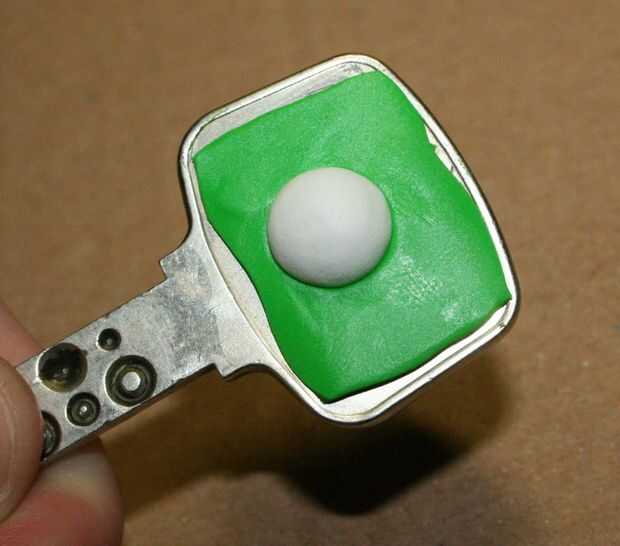 5 - hacer una bola con arcilla blanca. Presione contra la mesa para que tenga una parte plana. Colocar en el agujero.