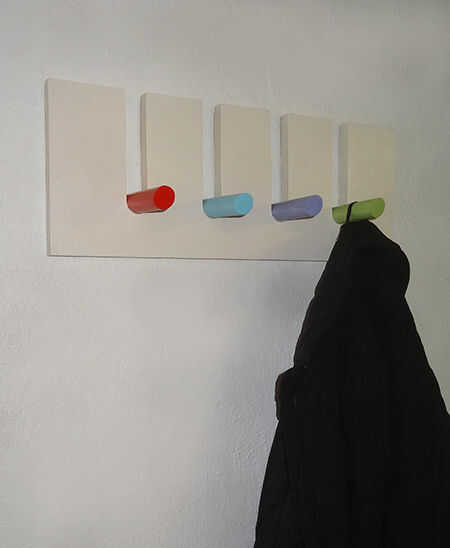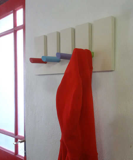 Utilice un trozo de pino, madera contrachapada o MDF, una clavija de 25mm y algunos pintura en aerosol Rust-Oleum 2 UltraCover X hacer este pasador colgante estante. Esta clavija clavija estante para colgar puede instalarse fácilmente en un pasillo para abrigos, en un baño para las toallas, o en el dormitorio de los niños. Usted puede hacer un estante más largo para clavijas de suspensión más y elegir tus propios colores para las clavijas.