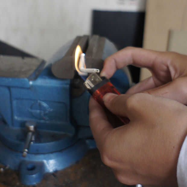 Cuando calienta el tubo, se encogerá firmemente sobre la uña. Se utilizó un mechero para calentar la tubería, pero un obras de secador de pelo mejor.