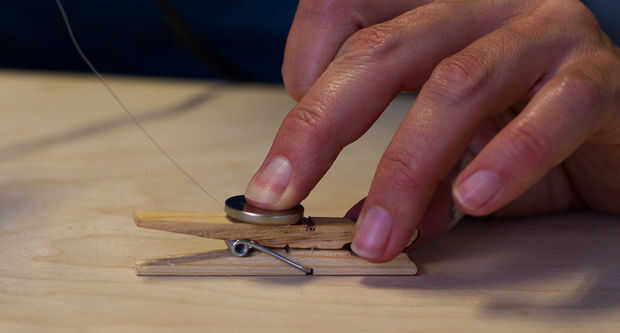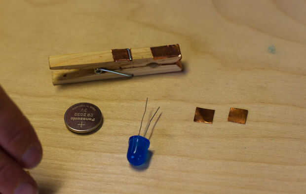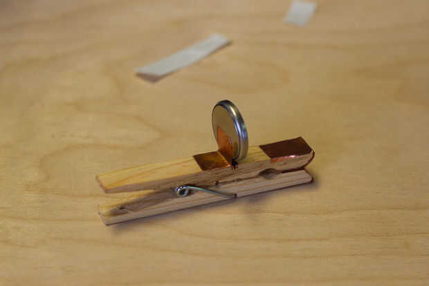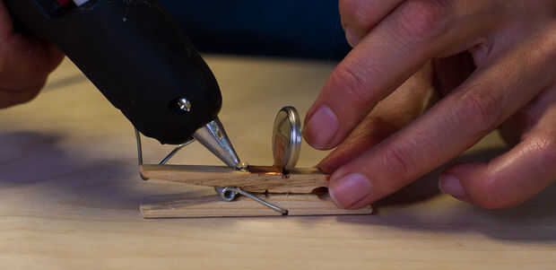 Pegamento caliente el lado negativo de la batería a la madera.