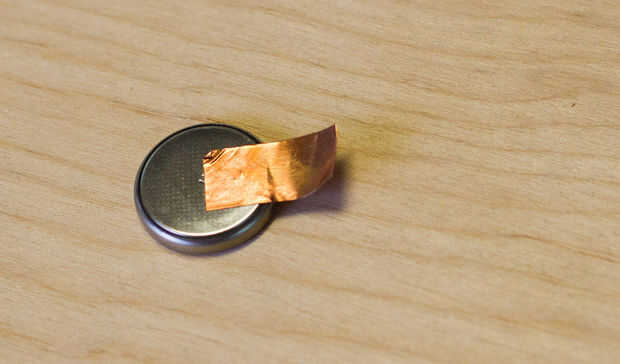 Pegar la mitad del cobre más próximo al lado negativo de la batería con exceso colgando sobre el borde.