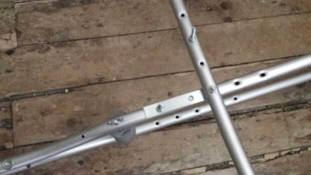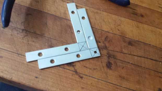 Estas son las llaves de esquina que compré para fijar las dos muletas en un ángulo. Tenía que marcar y taladrar en la esquina por lo que he podido conseguir un tornillo con dos muletas. Que hecho, me uní a los dos muletas medio junto con las contratuercas.