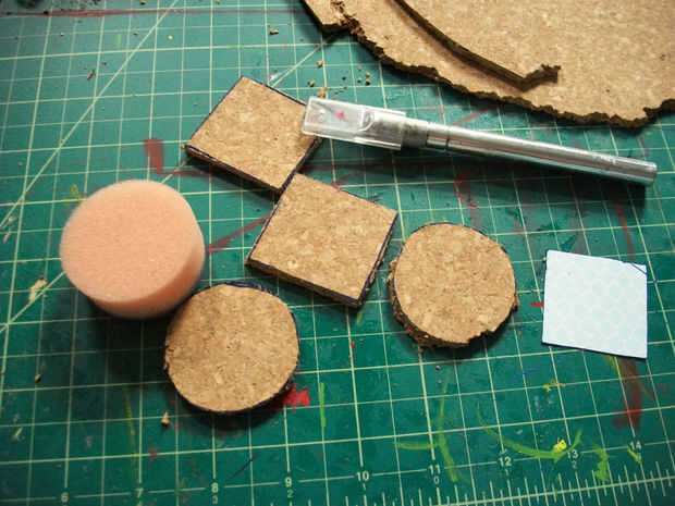 En primer lugar, utilice su cuchillo x-acto para cortar la placa de corcho en cualquier forma que te guste. Estoy haciendo círculos y cuadrados.
