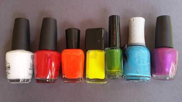 • uñas de rojo, naranja, amarillo, verde, azul, púrpura y blanco
