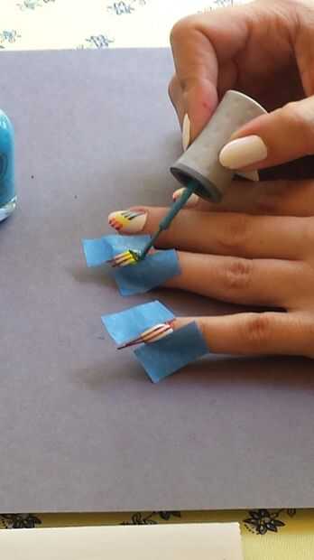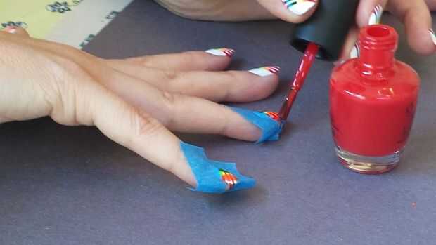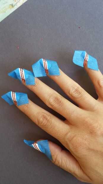 Repita la pintura y pelar pasos de cinta para cada clavo. Otra vez, me resulta más fácil hacer todas las uñas en una mano uno por uno, deja secar unos minutos y luego pasar a la siguiente mano.