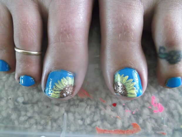 Tomar todo el pulimento apagado del cepillo del arte del clavo negro y sumergir en amarillo, luego sumerja la punta en negro (esto será agregar detalles a los pétalos) hacer pequeños trazos a partir del marrón, que sale sin embargo de largo usted desee los pétalos que. Volver a bañar cuando sea necesario. Luego, limpie el amarillo apagado el cepillo negro y sumergir en el negro. Utilizando el blanco y los pinceles de arte negro, hacer puntos en el marrón. Cuando el esmalte se seque completamente, aplique la capa superior. Y con eso, su diseño en acabado :)