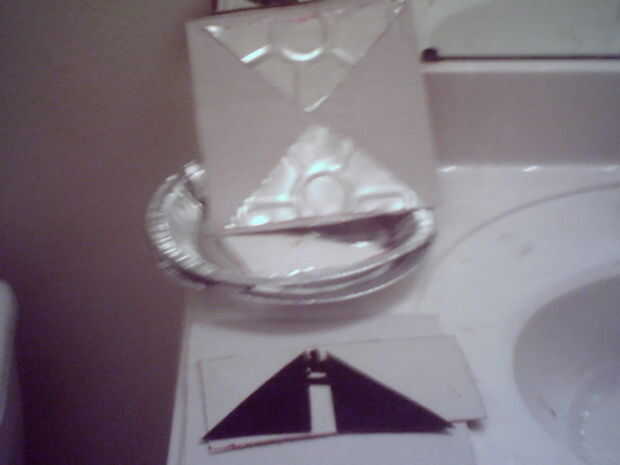 Tartera de almacén del dólar era más grueso que el papel de aluminio estándar. Tiene dos bandejas de pie para hacer los dipolos. Afortunadamente, todavía tenía la forma de la unidad original. Dibujó las líneas de barrera y luego recorte los triángulos. Los triángulos fueron Unidos para formar cartón con cinta adhesiva.