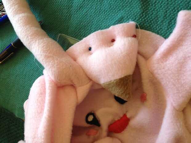 Tomar las orejas y les materia, luego pin sobre la tela del cuerpo principal, como se ve en la figura 1. Lo mismo para piernas, cosas y pin. Tomar el otro lado del cuerpo y perno para alas, la cola está dentro y el interior es ahora hacia fuera.
