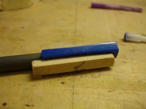 Pegamento caliente la longitud de la madera en el tubo de la pluma de manera que se detiene el clip de giro al hacer clic en.