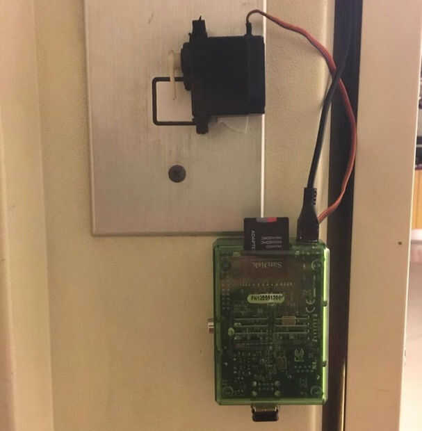 Para el servo del comando he usado Node.js como un webservice y escribió un sencillo script que ejecuta los comandos de shell que el servo gire y "click" el botón del elevador.
