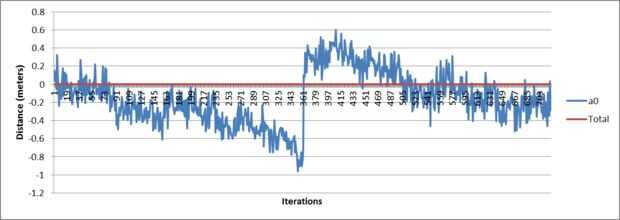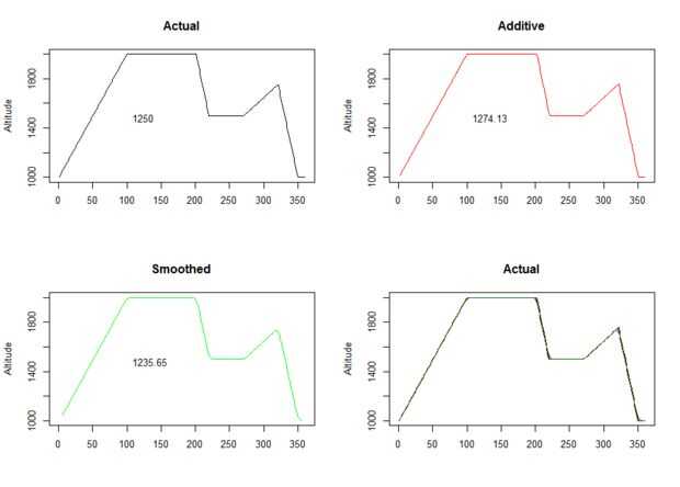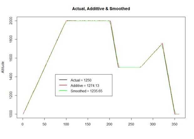 Como se puede ver, sólo tomando los cambios positivos en altitud a partir de los datos del sensor, como haríamos en un mundo perfecto termina por sesgar la distancia total subida en la dirección positiva. Este error es iterativo con cada lectura del sensor por lo que con el tiempo crecerá la cantidad de por que la distancia total es sesgada. Suavizado de los datos tomando un promedio de 10 lecturas evita este pasado.