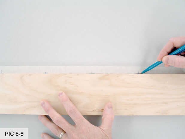 Mantenga el tablero contra la pared justo debajo de las marcas de paso. Coloque el nivel en el centro del tablero. Ajuste la Junta arriba/abajo en cada extremo hasta que la burbuja del nivel esté centrada. (PIC 8-7) Sujete la junta firmemente contra la pared y "ligeramente" poner un hash horizontal en cada marca de verificación. (PIC 8-8)