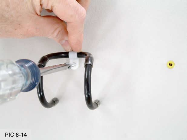 Apriete la abrazadera del cable para que coincidan los agujeros. Empuje y gire el tornillo un par de veces para conseguir comenzó en la abrazadera. (PIC 8-12) El tornillo debe empujar un poco hacia la parte posterior y sujetan la abrazadera. (PIC 8-13) Atornille la abrazadera del cable en el anclaje. Asegúrese de que la abrazadera del cable se queda en el centro de la curva. Soporte de la pinza con los dedos al apretar para evitar que la abrazadera en posición. (PIC 8-14) No apriete en exceso. Sólo apriete hasta que comience a sentirse cómodo.