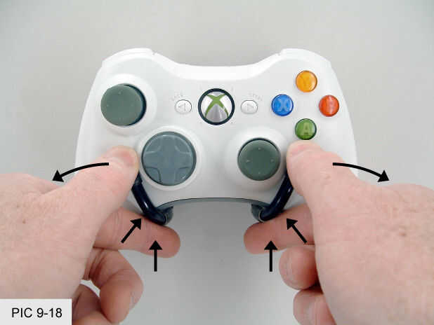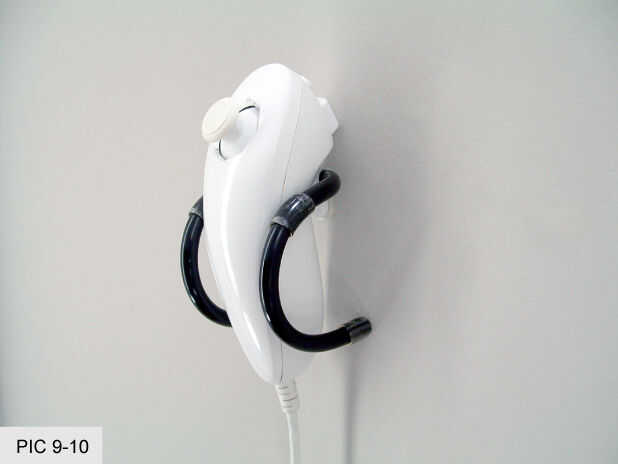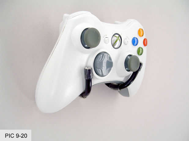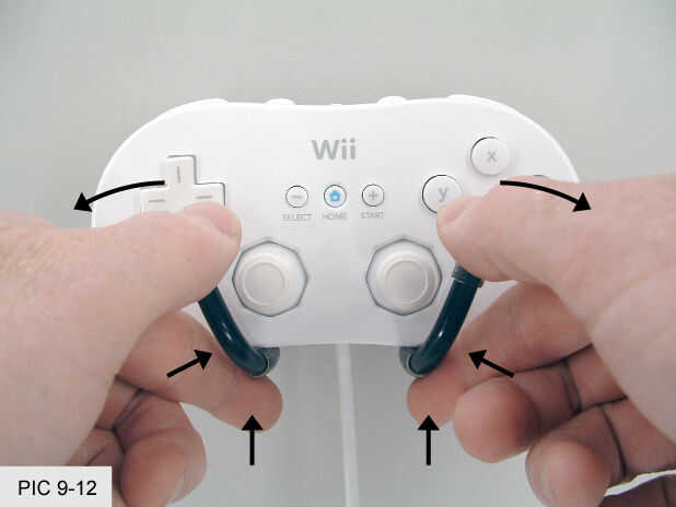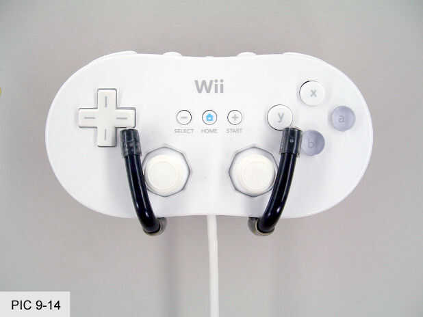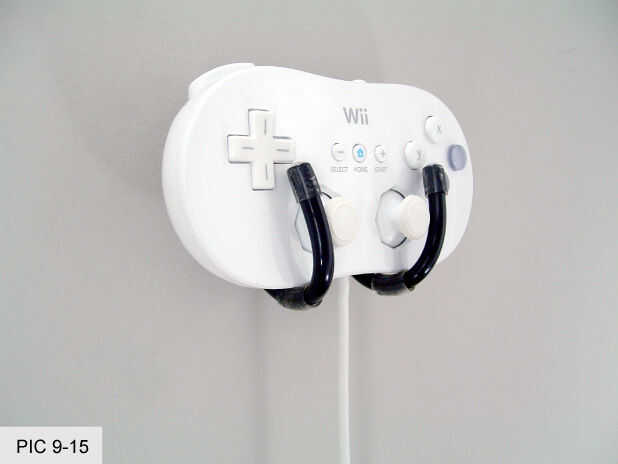 Controladores clásicos son presa de las patas de la pinza. Coloque el clip en la pared como un "gancho". Coloque el controlador en el clip y extender las piernas hacia afuera en forma de v por lo que se sitúan a las afueras de los thumbsticks. Extendiendo las piernas, apoyar la parte inferior de la pinza con los dedos índice, tan sólo las piernas giran hacia el exterior. (FOTO 9-12) Para un agarre firme, quite el controlador y empuje las patas hacia adentro un poco por lo que pondrá en contacto con el controlador. (FOTO 9-13) Vuelva a colocar el controlador de prueba. Ajustar por consiguiente. (PIC PIC DE 9-14, 9-15)