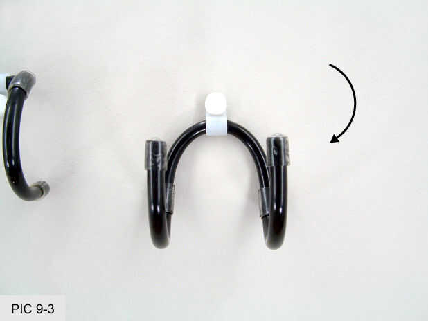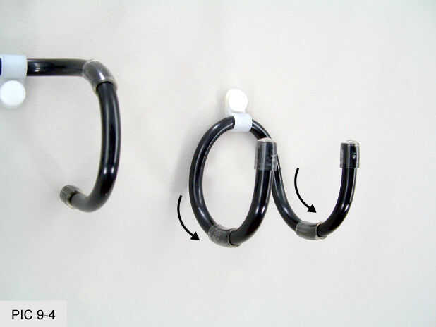 Gire el gancho hasta tocar la pared. (FOTO 9-2) Ahora gire el clip alrededor del tornillo 180 grados. (FOTO 9-3) Las piernas actúan como ganchos. Arrastra los topes para que descansar en la curva de las patas. Ayudar las uñas. (FOTO 9-4)