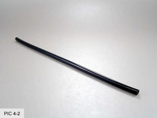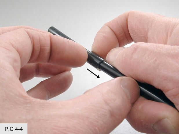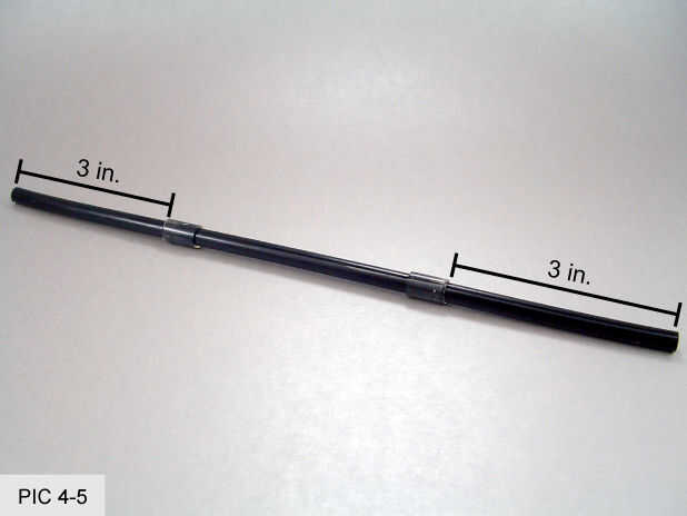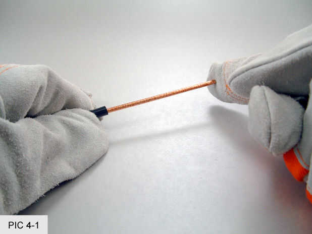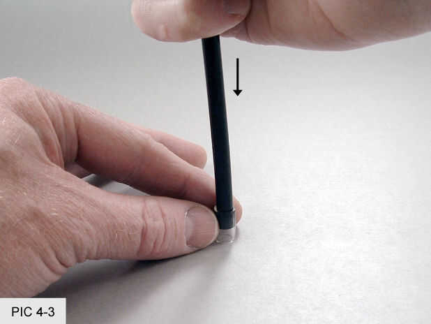 Empuje un tope en el extremo del tubo con la superficie de la mesa para aprovechar. (FOTO 4-3) Trabajar el tope el tubo de hasta 3 pulgadas desde el extremo. Esto puede ser difícil ya que los topes tienden a pegarse a la tubería. Las uñas ayudan a agarrar y arrastrar en su posición. Tener cuidado de no doblar el cable en el tubo durante este proceso. (FOTO 4-4) Repita para el otro tope en el otro lado de la tubería. (FIG 4-5)