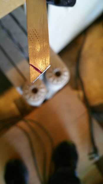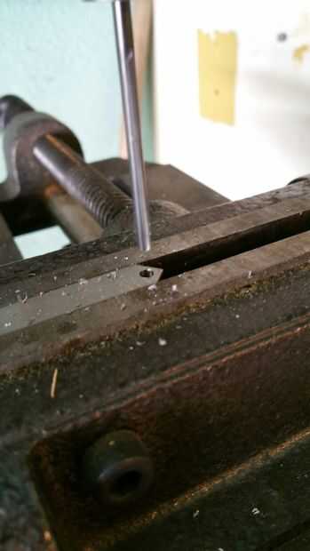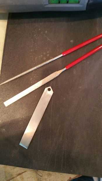 dibujé una línea para que pudiera cortar un punto bastante preciso. Después de lo cual llevó a la prensa del taladro para perforar el orificio. no es necesaria una prensa pero sucede que uno tiene y hace cosas mucho más fácil. como el metal es inealed (ablandado) debe ser bastante rematadamente fácil perforar hacia fuera. Usé 1/8 pulgada broca para el taladro. A continuación sujeta al Banco de trabajo y arena y presentó los bordes del metal. Tengo un conjunto de archivos de micro (grano 150) que funcionó bastante bien.