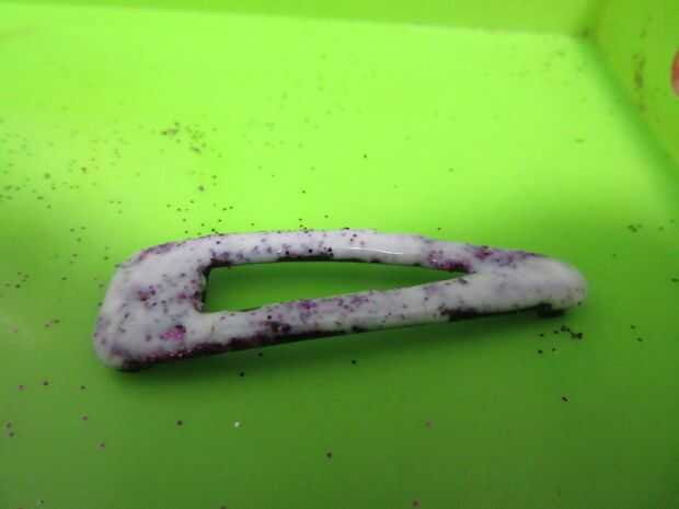 fuentes:-zapato blanco clip-arcilla polimérica-un pegamento que funciona en metal y plástico-pintura acrílica-lámina de arte-papel de lija-barniz mate o brillo-cepillosInstrucciones:1) usando la hoja de arte o simplemente las manos, hacer un par de f
