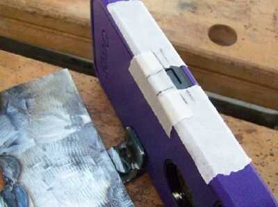 La ficha original de elástica plástico tiene una punta en lo que encaja en una cavidad rectangular en el lado de la caja del teléfono. Añadí cinta de enmascarar y extendido las líneas que definen la ubicación de la hendidura por lo que yo puedo marcar la pestaña superior mientras que yo soy incapaz de ver el hueco y su ubicación, excepto las marcas en la cinta.